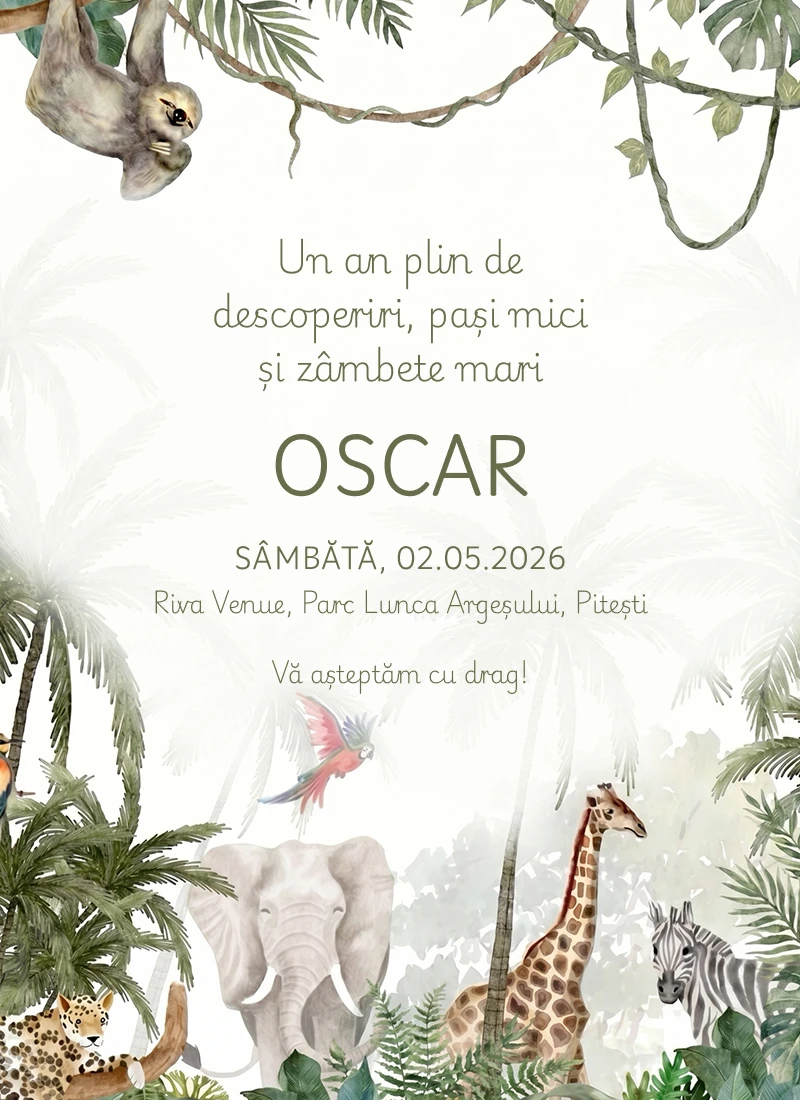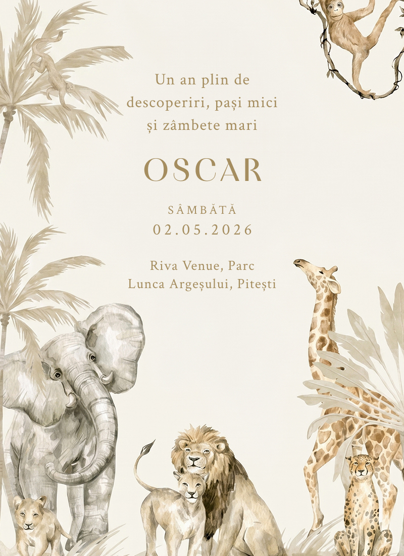 Acest model "Safari Watercolour" este perfect pentru: Botez. Designul și stilul sunt adaptate specific pentru aceste tipuri de evenimente, asigurând o experiență autentică și elegantă.
